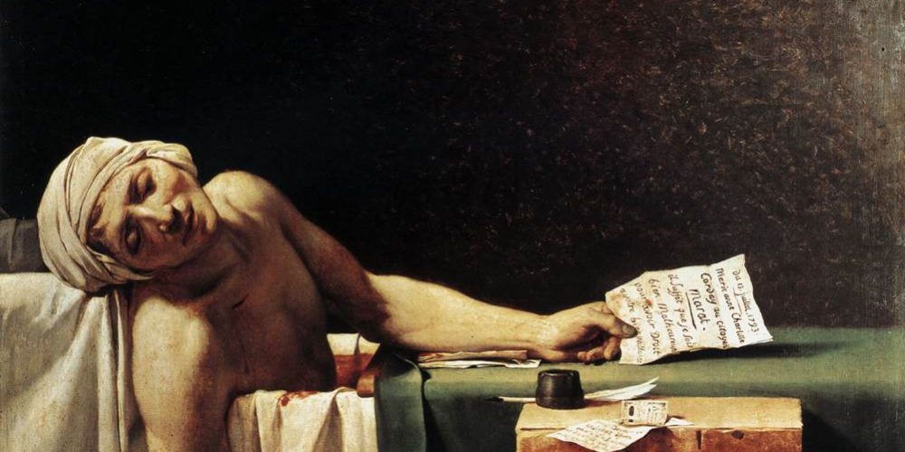 Le mois de juillet 1793 fut un mois dramatique dans l’histoire de la presse révolutionnaire. Disparaissent les journaux royalistes et ceux des Girondins mis hors la loi. A la date du 13 juillet, Marat est assassiné. Le peintre Jacques-Louis David lui consacre l’oeuvre La mort de Marat, gisant au pied de la baignoire où le journaliste soignait une maladie de peau. A ses côtés le couteau qui l’a fait taire et la plume d’oie dont il se servait pour écrire son article du lendemain.