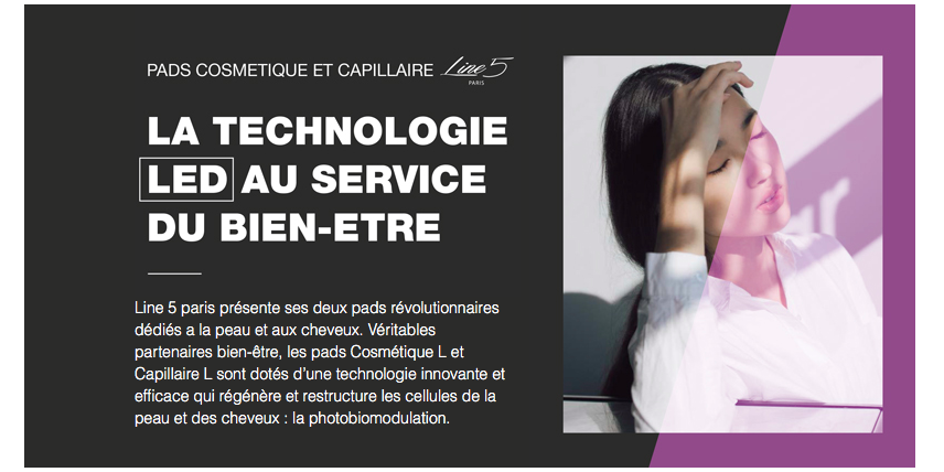 Line 5 Paris présente ses deux pads révolutionnaires dédiés à la peau et aux cheveux. Véritables partenaires bien-être, les pads Cosmétique L et Capillaire L sont dotés d’une technologie innovante et efficace qui régénère et restructure les cellules de la peau et des cheveux : la photobiomodulation.