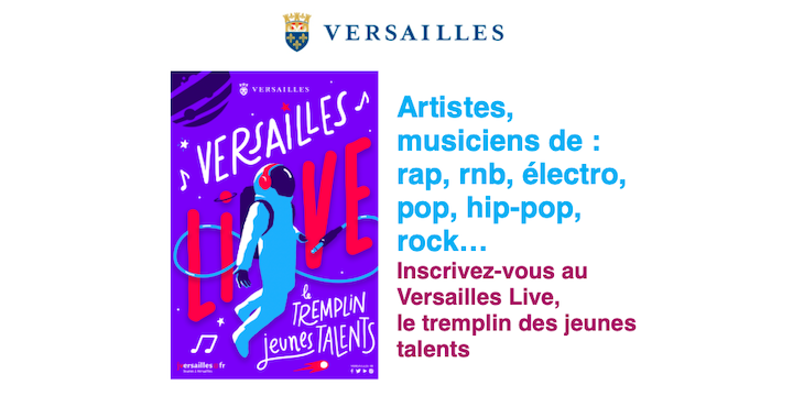 Le tremplin des jeunes talents Versailles Live (anciennement Les Vendredis du Rock ) ouvre pour ses 10 ans sa sélection à tous les univers musicaux. Organisé par la Ville de Versailles, Versailles Live est un tremplin musical destiné à promouvoir des groupes de musiques actuelles en voie de professionnalisation. C’est Gratuit ! Le concours révèle et propulse de jeunes talents et futurs grands noms d’une nouvelle vague de la Versailles Touch.