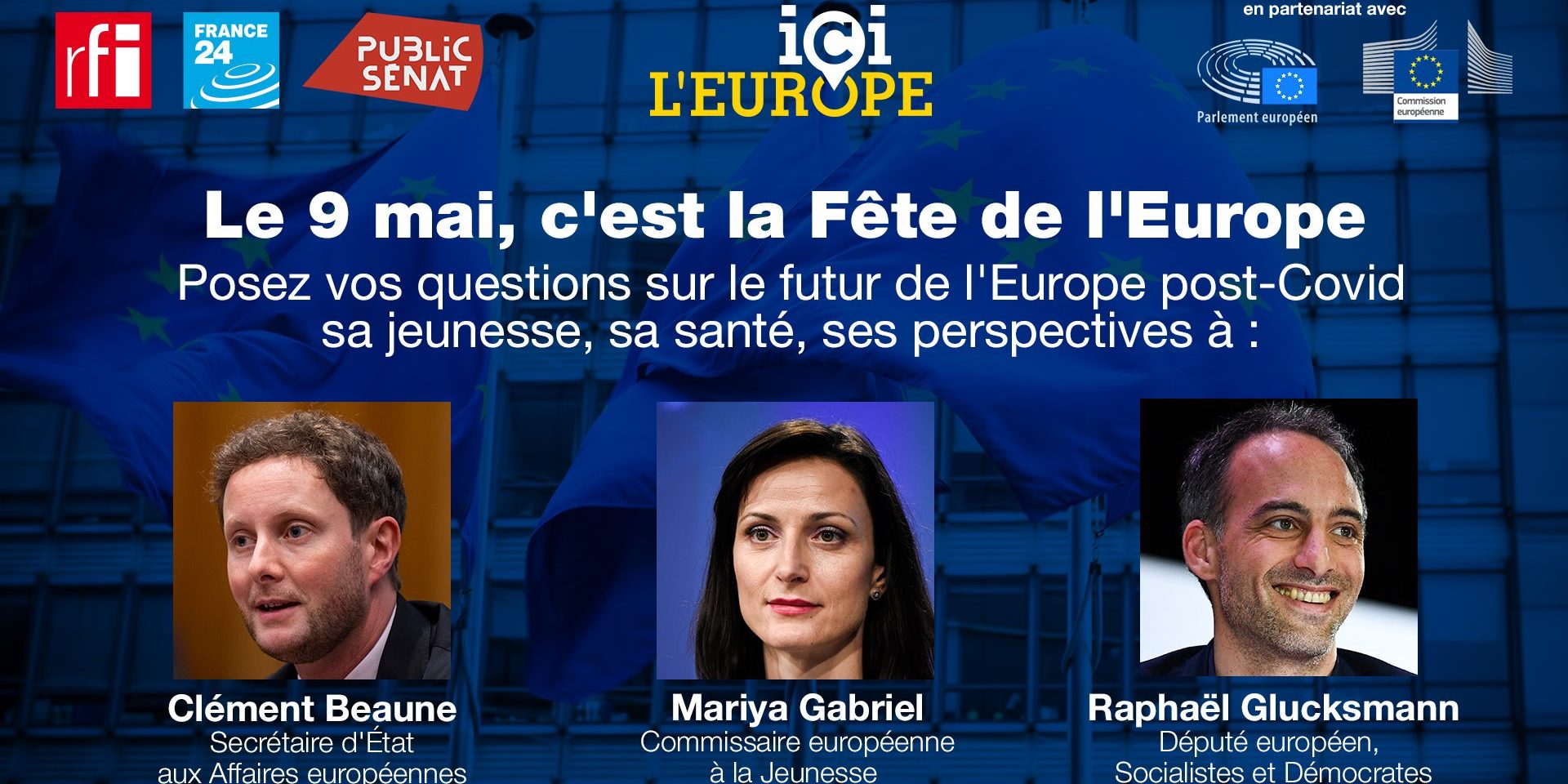 La journaliste Caroline de Camaret accueillera sur le plateau de France 24 un Commissaire europĂ©en, le secrĂ©taire dâEtat aux affaires europĂ©ennes ClĂ©ment Beaune et le dĂ©putĂ© europĂ©en RaphaĂ«l Glucksmann pour un dialogue citoyen sur la jeunesse et lâavenir de lâEurope au cours duquel ils rĂ©pondront au questions des citoyens posĂ©es via les rĂ©seaux sociaux. Le dĂ©bat sera prĂ©sentĂ© par Caroline de Camaret, Dominique Baillard et Marie BrĂ©meau et diffusĂ© sur France 24, La chaine parlementaire, Public Senat, radio RFI et Franceinfo.