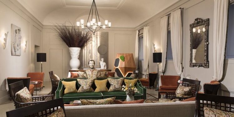 Le lobby, qui se distingue par ses tons chauds de brun, d’orange, de vert et d’ocre, est devenu un havre accueillant pour les clients, évoquant le sens d’un salon romain raffiné. Équilibrant l’ancien et le nouveau, des éléments du début du XXe siècle, tels que le bas-relief antique représentant l’archange Gabriel par le sculpteur Pietro Monti,
