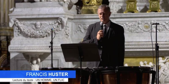 La photo de Patrick FILLON était projetée lors de la lecture de texte par Francis HUSTER. Ont succédé plus de 400 photos de policiers victimes du devoir projetées sur les colonnes entourant l’autel de l’église de la Madeleine.