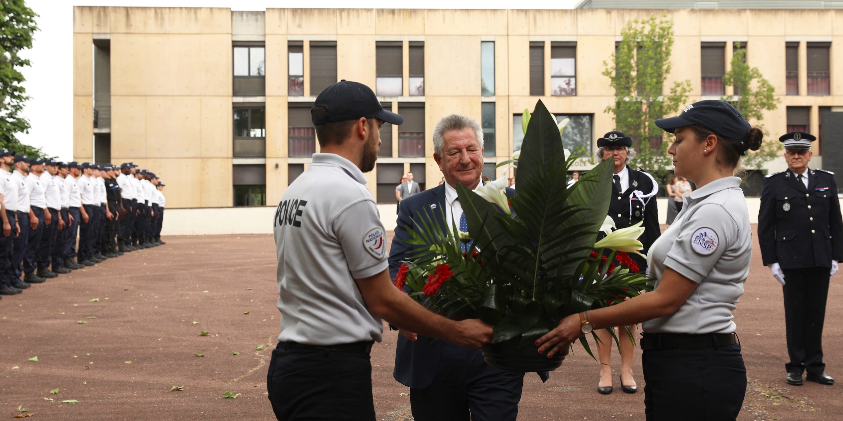 Photo en Une : Dépôt de gerbe le 19 mai 2022 de Christian SONRIER, président de l’AHFPN, à la stèle de l’ENSP, commissaires morts en service © AHFPN