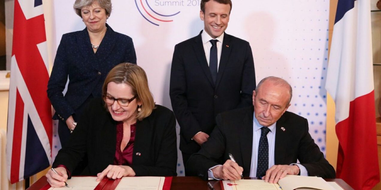 Photo en Une : Traité de Sandhurst (18 juin 2018) : Emmanuel Macron et Thérésa May signent un traité sur le contrôle de l’immigration à leur frontière en lieu et place de l’Académie militaire de Sandhurst, à l’ouest de Londres. Source : X (ex Twitter) @EmmanuelMacron