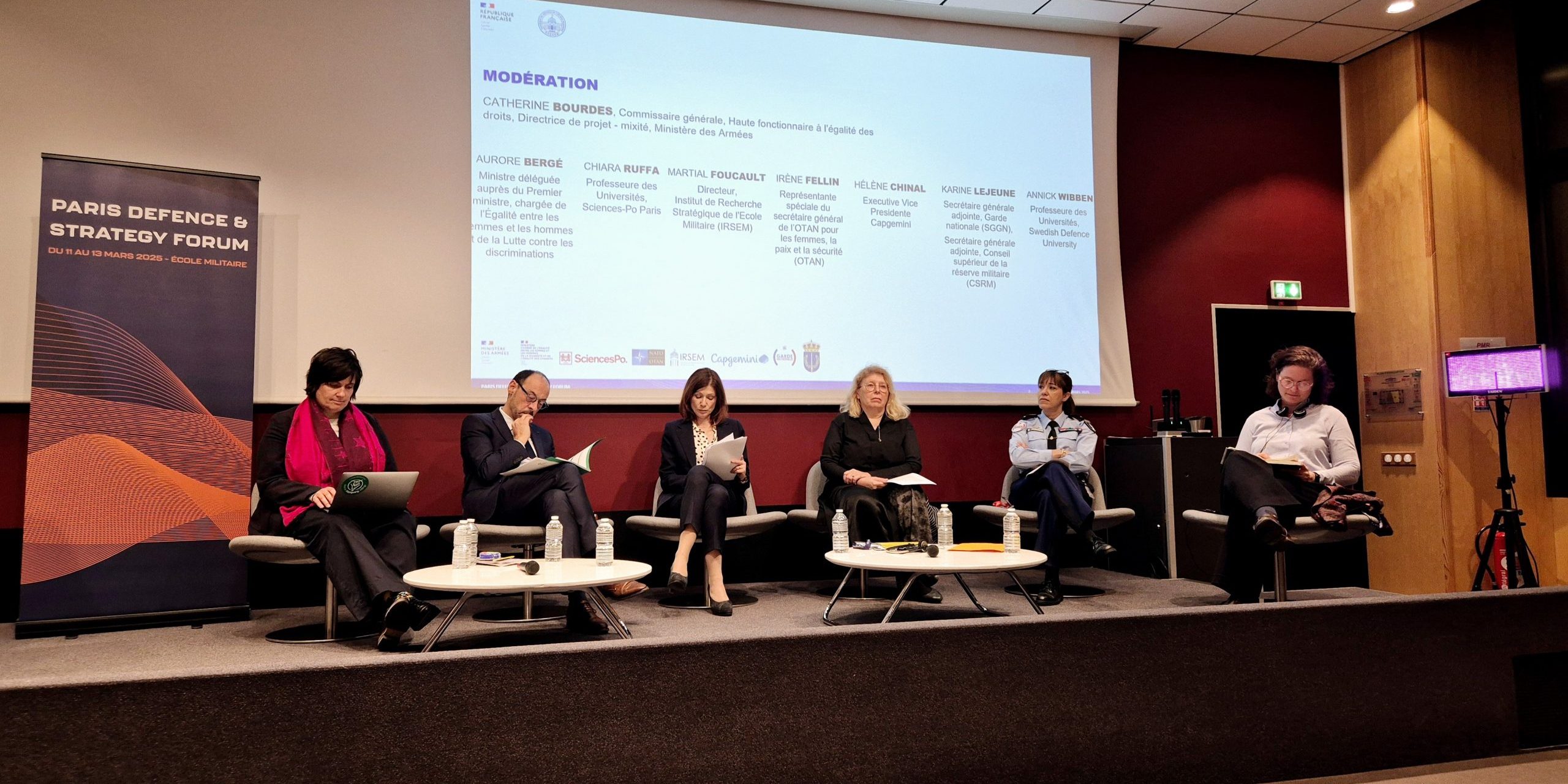 Chiara RUFFA, Professeure des Universités, Sciences-Po Paris, Irène FELLIN, Représentante spéciale du Secrétaire général de l’OTAN, générale Karine LEJEUNE, Martial FOUCAULT, Directeur, Institut de Recherche Stratégique de l’École militaire (IRSEM), Hélène CHINAL, Executive Vice President, Capgemini et Annick WIBBEN, Professeure des Universités, Swedish Defence University.