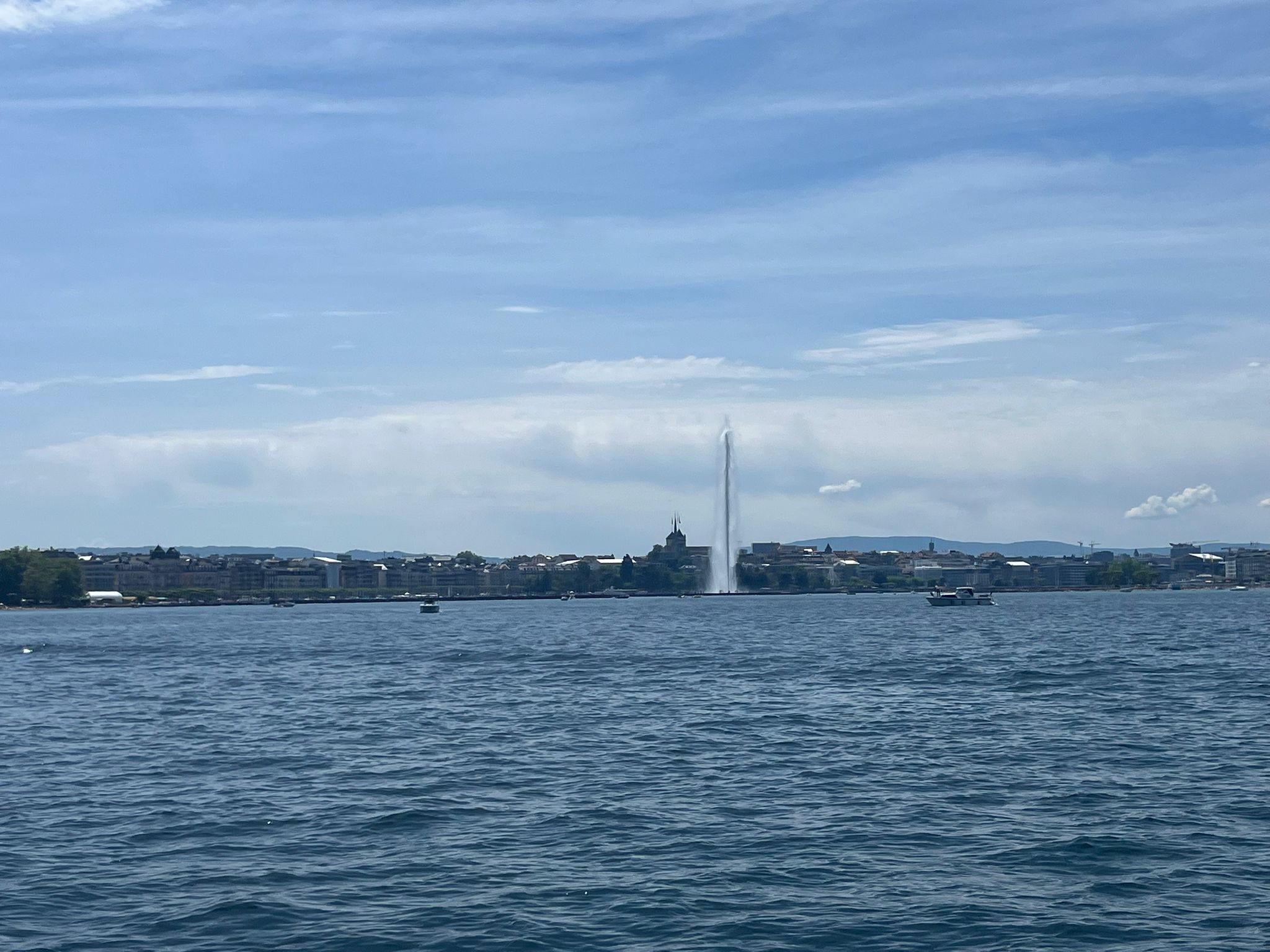 Vue sur le Jet d’Eau de Genève à l’arrivée le 31 mai 2025 © Léa Piwowarczyk au défi du Léman 2025