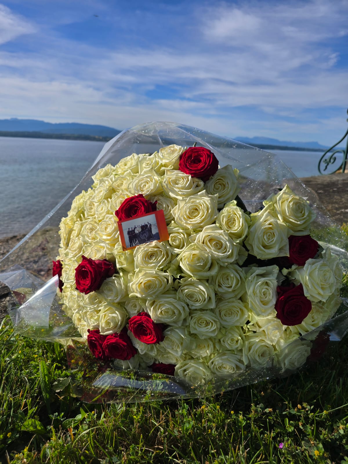 Bouquet de 99 roses, offert à la Princesse Napoléon, au petit matin du 31 mai 2025. Ce bouquet comprenanit 99 roses dont 13 roses rouges car elle est marraine u 13ème RDP © Léa Piwowarczyk