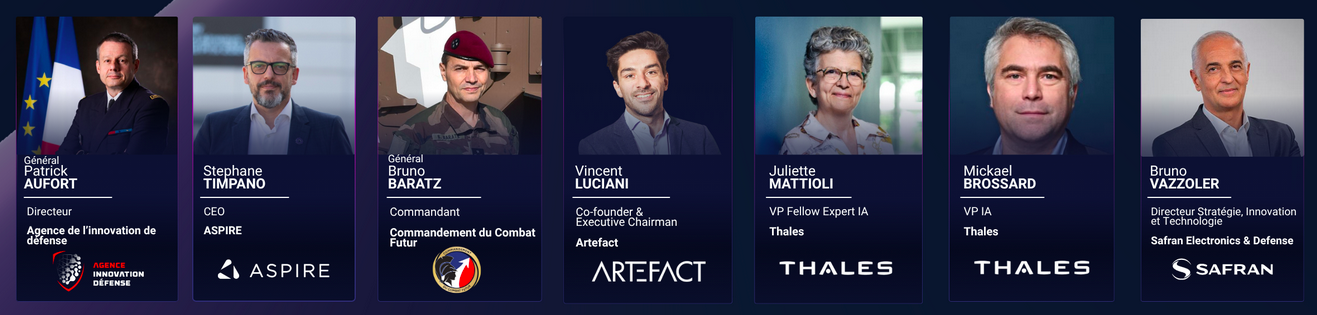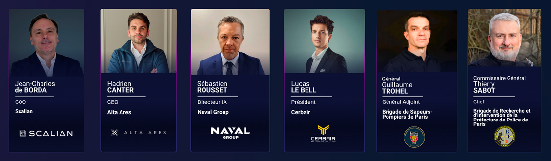 Membres du Jury Drone Défense Hackathon 2025 – Bastien Mancini-Antoine De Braquilanges-Laurent Duport-Martin Karkour-Colonel Thierry Cadot-Nadia Maaref-Mikael Volut
