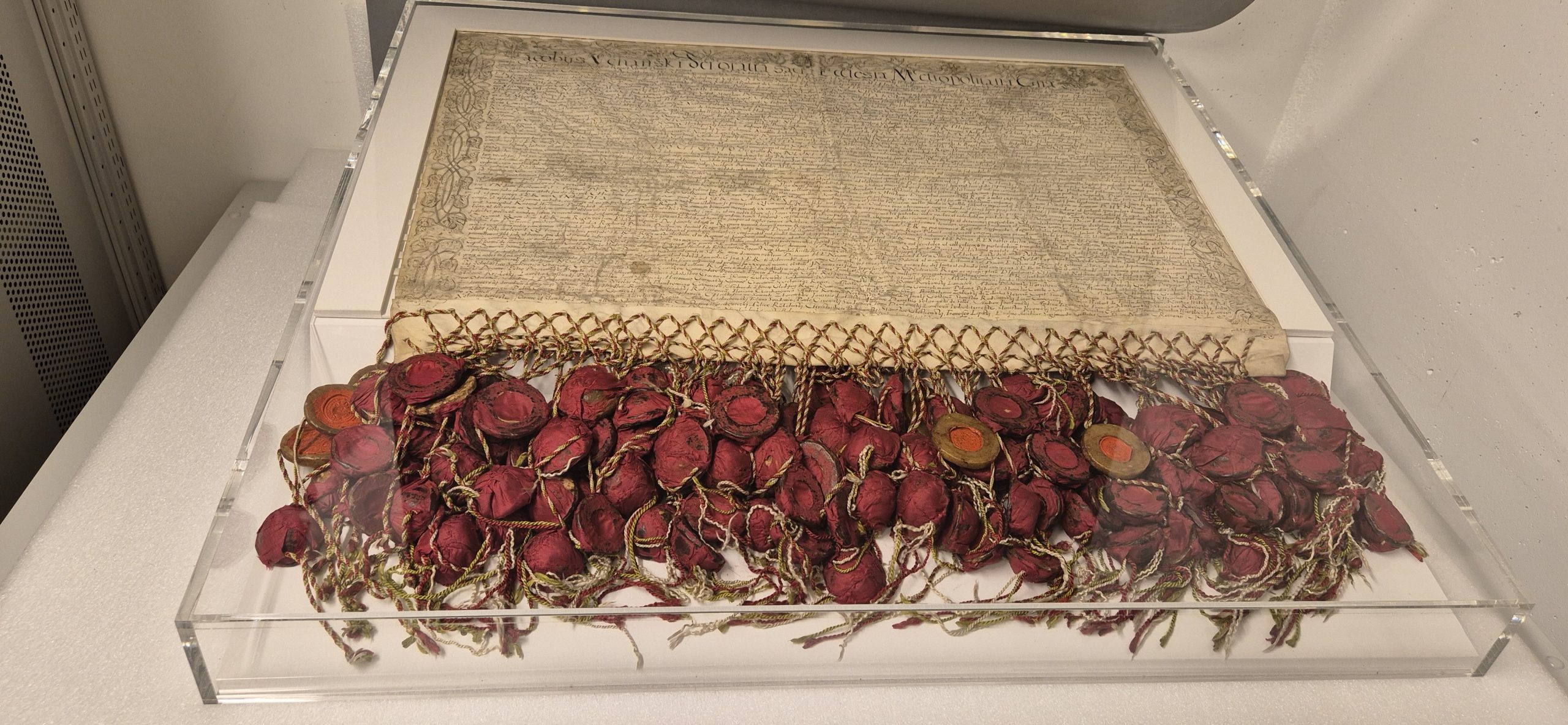 Aux Archives diplomatiques – Acte restauré de 1573 sur l’élection d’Henri III à la tête du royaume de Pologne, avec les sceaux de tous les nobles présents à l’élection © Miss Konfidentielle