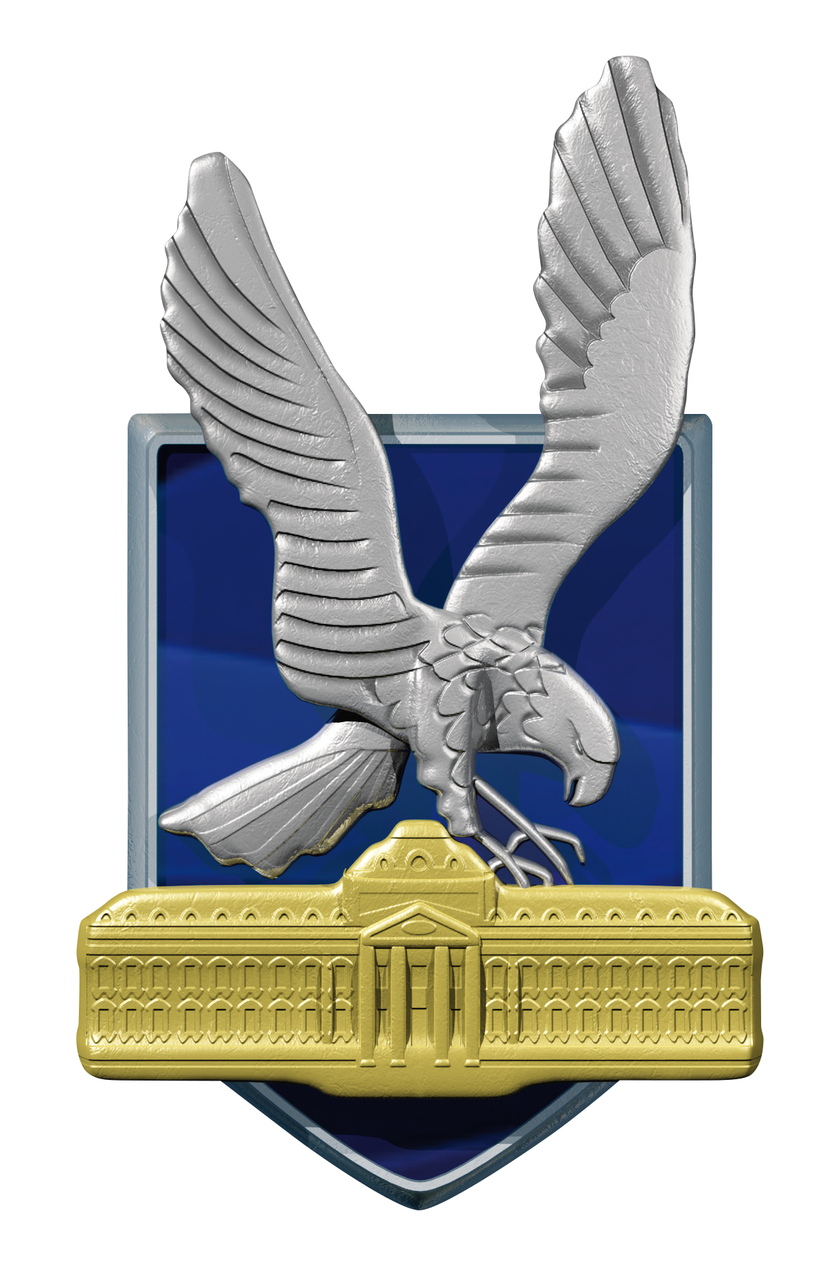Définition héraldique « Ecu ancien d’azur à la bordure d’argent, chargé d’un aigle du même essorant contourné et dépassé en chef, à la tête penchante, empiétant sur un bâtiment d’or également dépassé à dextre et senestre de la pointe. » Transcription : Aigle d’argent en relief (1er plan) prenant son envol au-dessus de la façade centrale de l’École Militaire (en bronze au 2e plan). Symbolisme de l’insigne : l’aigle, symbole traditionnel de l’armée de l’air, le bâtiment qui représente l’École militaire, lieu de perfectionnement de la formation des officiers de l’armée de l’Air et de l’Espace. Le fond est composé d’un écu bleu aviation bordé d’argent.